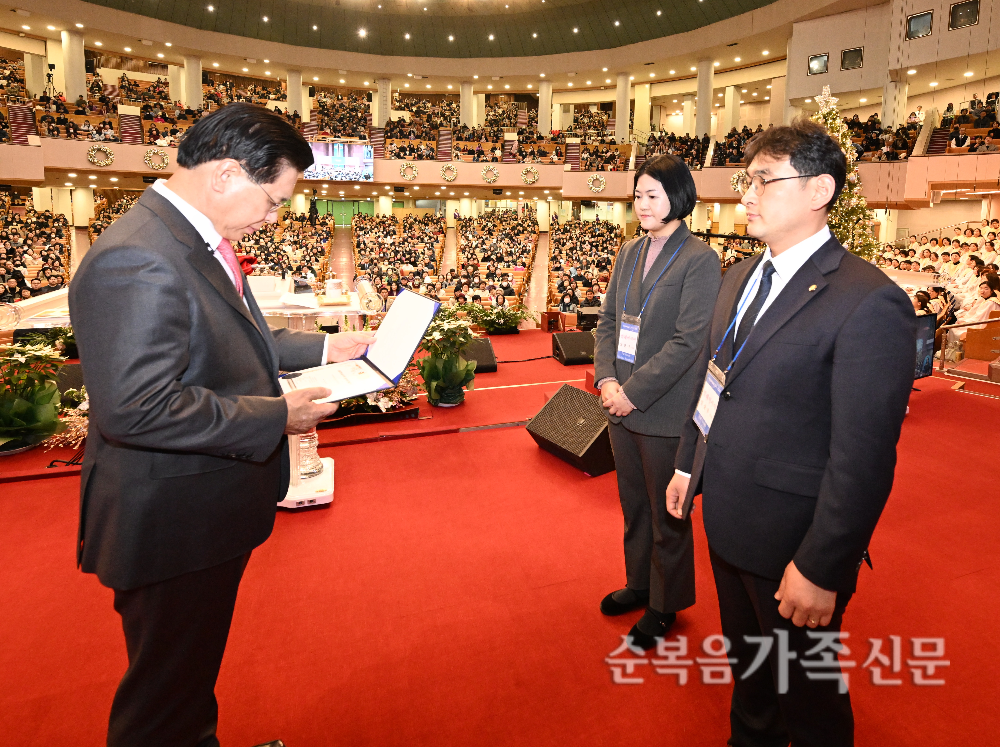 선교사 파송식이 12월 28일 주일4부 예배 설교 후 대성전에서 진행됐다. 재단법인 순복음선교회 이사장 이영훈 목사는 이날 일본 교토순복음교회로 파송되는 유성은 목사(사진 위)와 말레이시아 코타키나발루에 교회를 개척하고 현지인 선교에 나서는 임상우 목사(사진 아래)에게 각각 선교사 파송장을 수여했다.