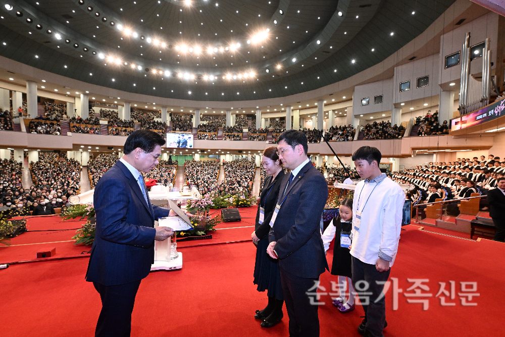 선교사 파송식이 18일 주일3부 예배 설교 후 대성전에서 진행됐다. 재단법인 순복음선교회 이사장 이영훈 목사는 정대섭(미국 애틀랜타 스와니순복음교회 담임·사진 위) 선교사와 이영직(케냐 굿 후르츠 파운데이션·Good Fruit Foundation) 선교사에게 각각 파송장을 수여하고 선교 사명 감당을 위해 안수기도 했다.